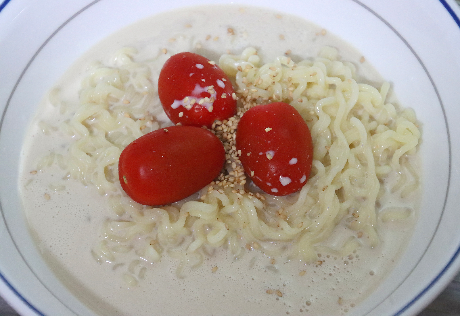 개인적으로 소면으로 먹는것 보다 라면사리에 콩물을 부어 먹는게 맛있더라고요, 어쩌다보니 진짜 초간단 레시피가 되어버렸습니다. 그냥 사리면 삶아서 미리 사둔 콩물을 붓고 깨소금 뿌리고 삶은 달걀이나 방울토마토를 올리면 끝!