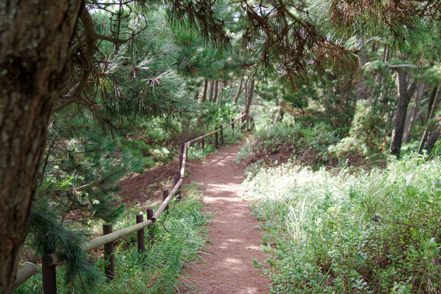 본격적으로 가볼까요? 올라가는데까지 정말 금방이지만 짧은 흙길도 있습니다. 이런 모습이에요. 삼봉해수욕장은 길게 뻗은 울창한 소나무 숲길도 유명해서 여름에 운영하는 캠핑장도 꽤 인기있는 곳입니다.