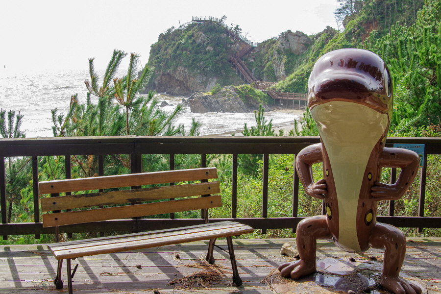 모래해변을 통하지 않고 지나가면 초입에서 전망대 봉우리를 배경으로 기념사진 포토존이 있어요. 옆에 있는 도마뱀 동상은 태안해안국립공원의 마스코트 표범장지뱀(멸종위기 야생생물 2급) 인 것 같습니다. 해안 산책길을 걷다보면 심심치 않게 볼 수 있어요. 귀엽게 생겼습니다. 최근에 개채수가 늘고있다고 하던데 다행입니다.