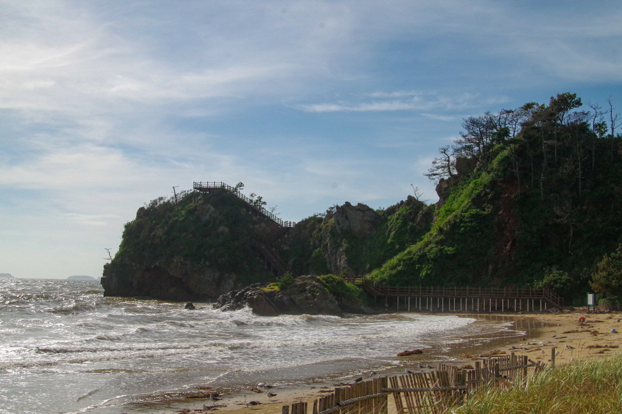 삼봉해수욕장이니까 어딘가에 삼봉(세 개의 봉우리)가 있겠죠? 저기 보이는, 바다를 바라보고 해수욕장 오른쪽 끝에 있는 저 봉우리가 삼봉 전망대입니다. 정확하게 어느게 삼봉인지 모르겠는데 아무튼 지도상으로도 저것 말고는 봉우리가 없거든요ㅋㅋㅋ 아무튼, 그 봉우리 꼭대기까지 올라가는 계단과 데크가 새로 생겼나봐요. 해변으로 걸어가도 되고, 해수욕장 초입에서 흙길로 걸어갈 수도 있습니다.