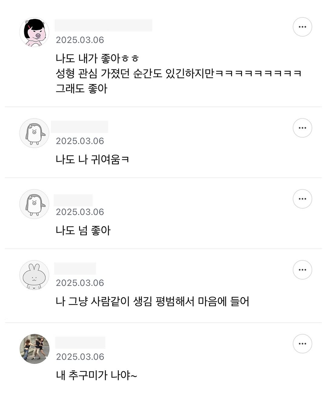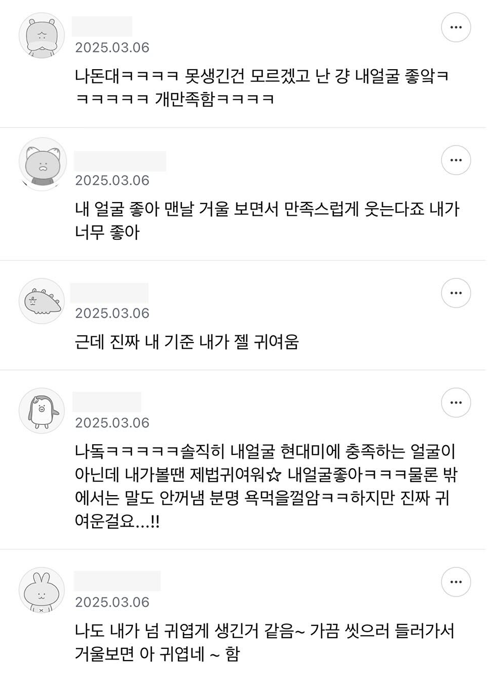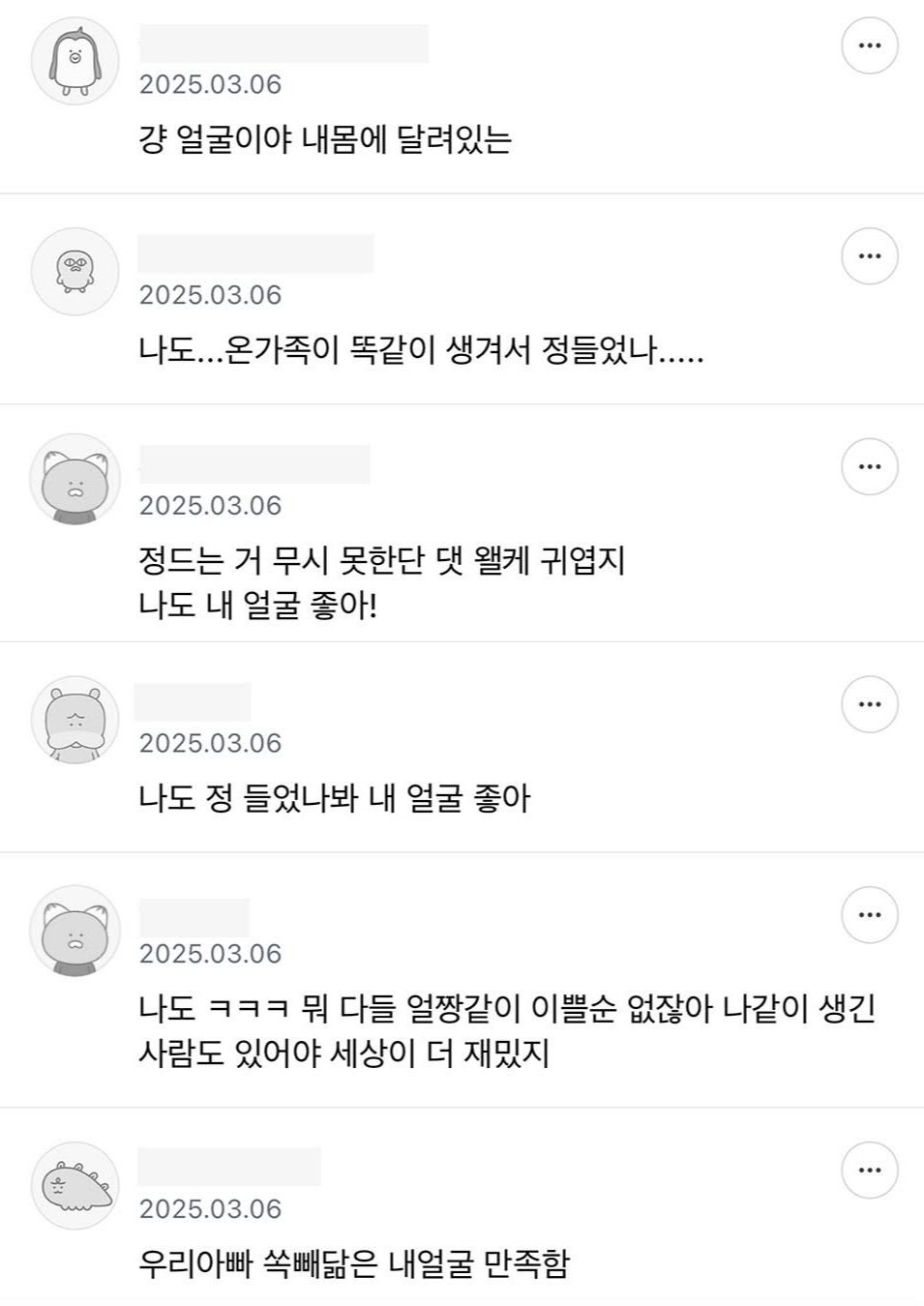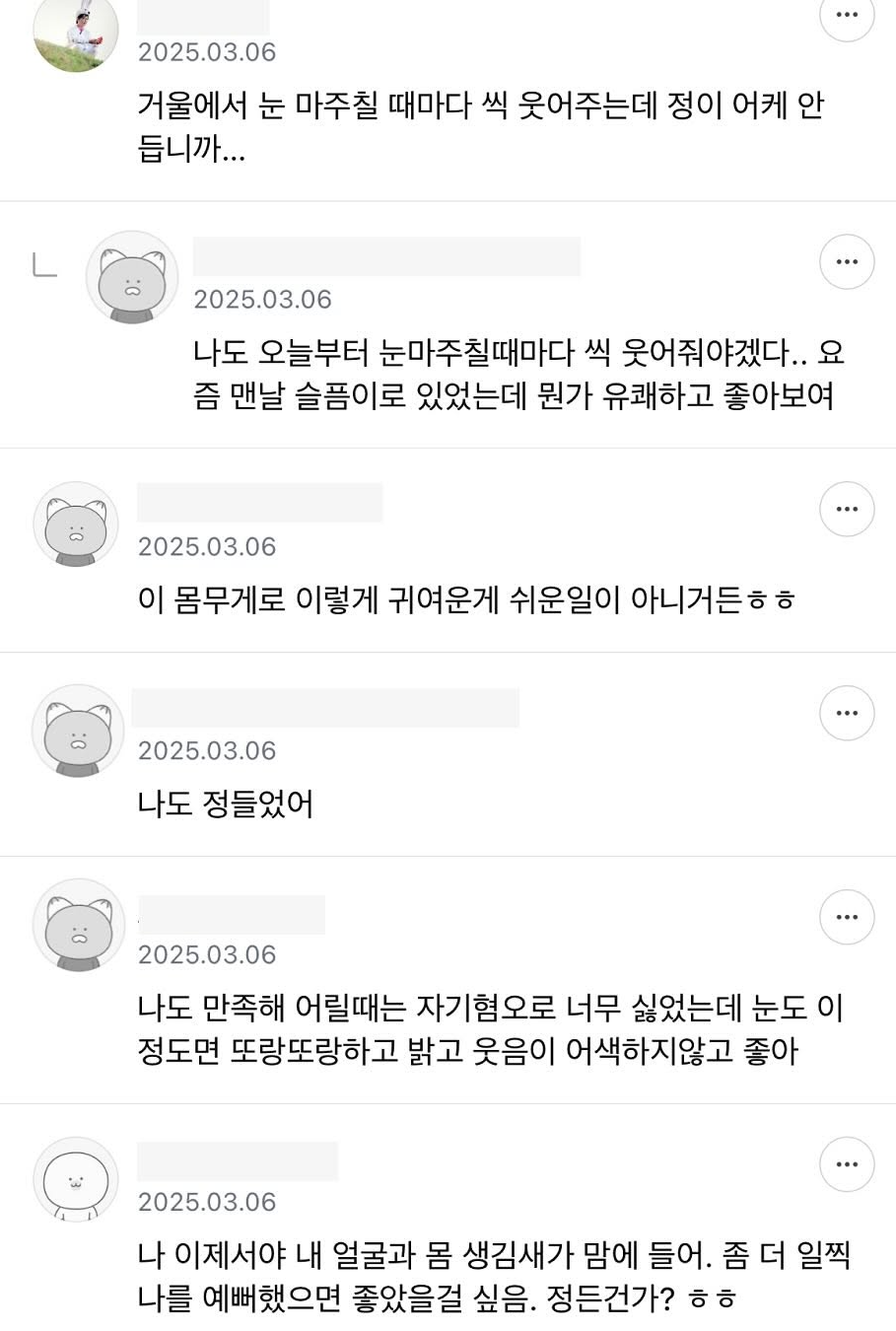 뭔가 이 긍정적이고 몽글몽글한 바이브 너무 좋고 뭔가 정 들었다는 말 왤케 공감되는지 모르겠네요. 어릴 땐 내 얼굴이 싫기도 했는데 나이 먹으면서 진짜 정들고 만족하게 됨. 추구미가 자기 자신이라든가 가족을 닮은 얼굴이 좋다든가 너무 예쁘고 멋진거 같아요. 글들이 너무 귀여워서 중간에 어떤 분이 얘기한 것 처럼 좋은 기운 같이 공감하고 느끼고 싶네요 :) 다들 즐거운 하루하루 되세요~!