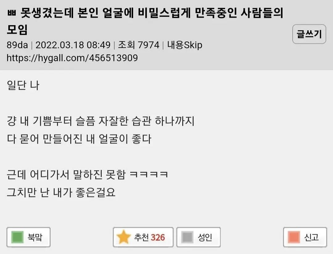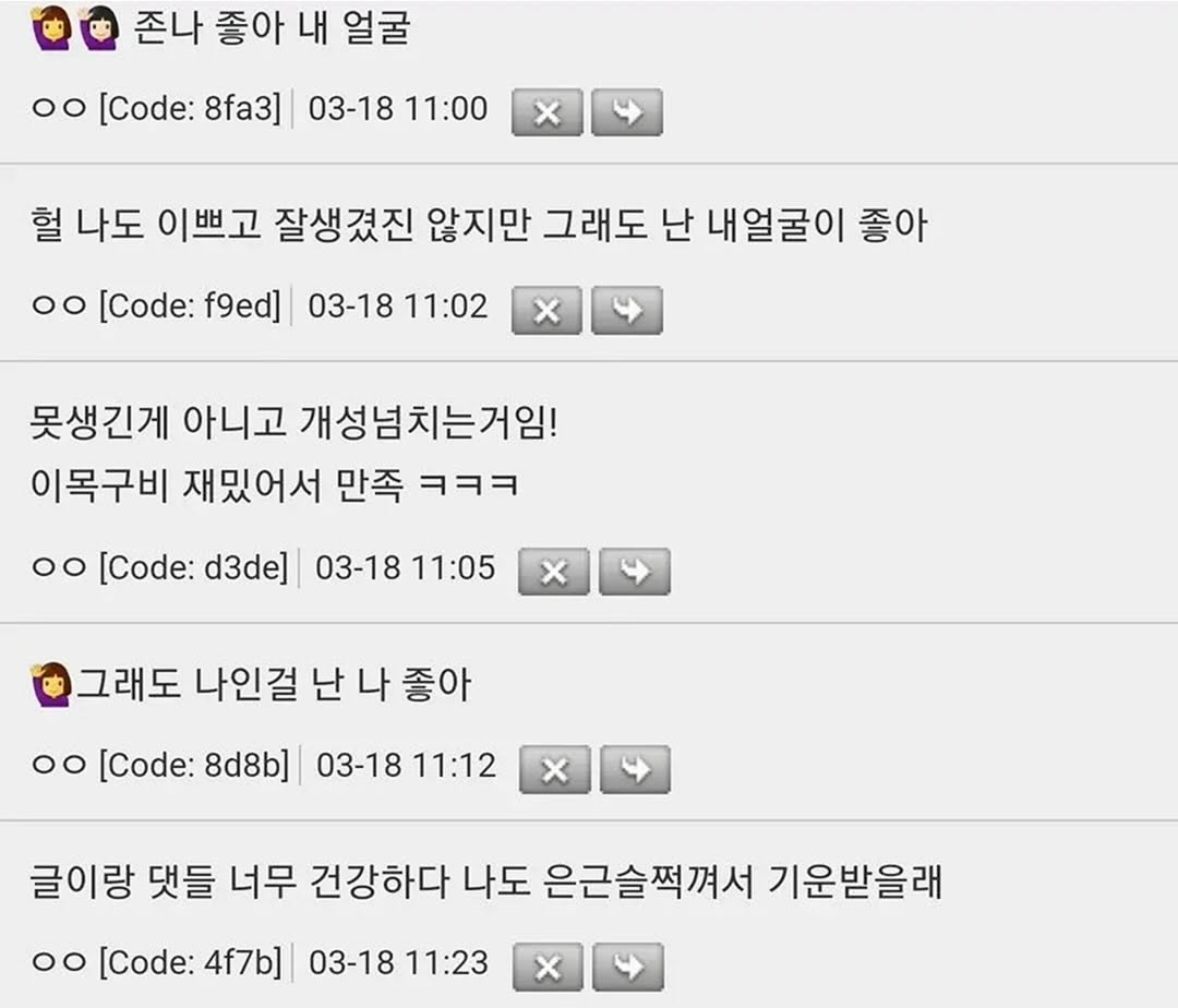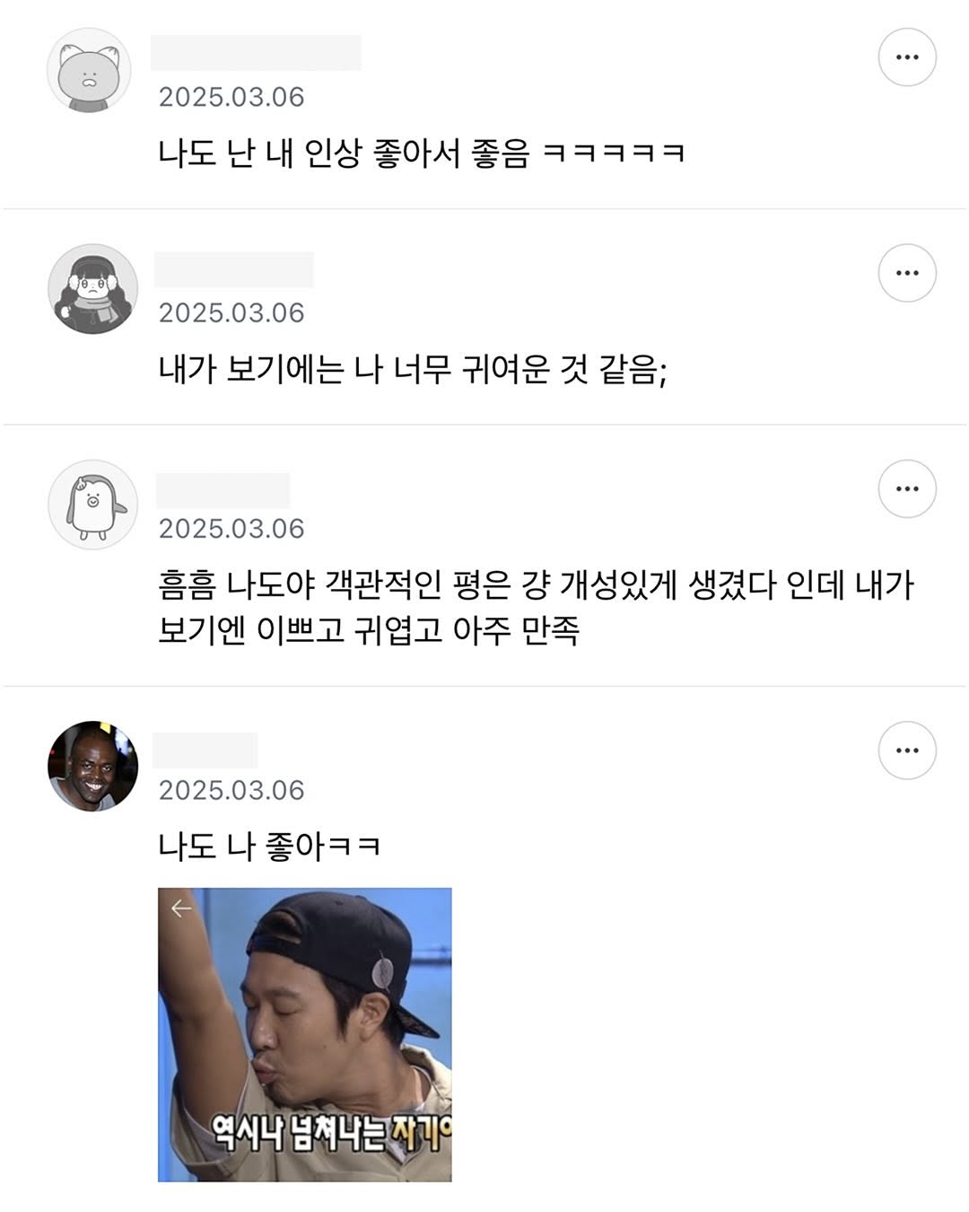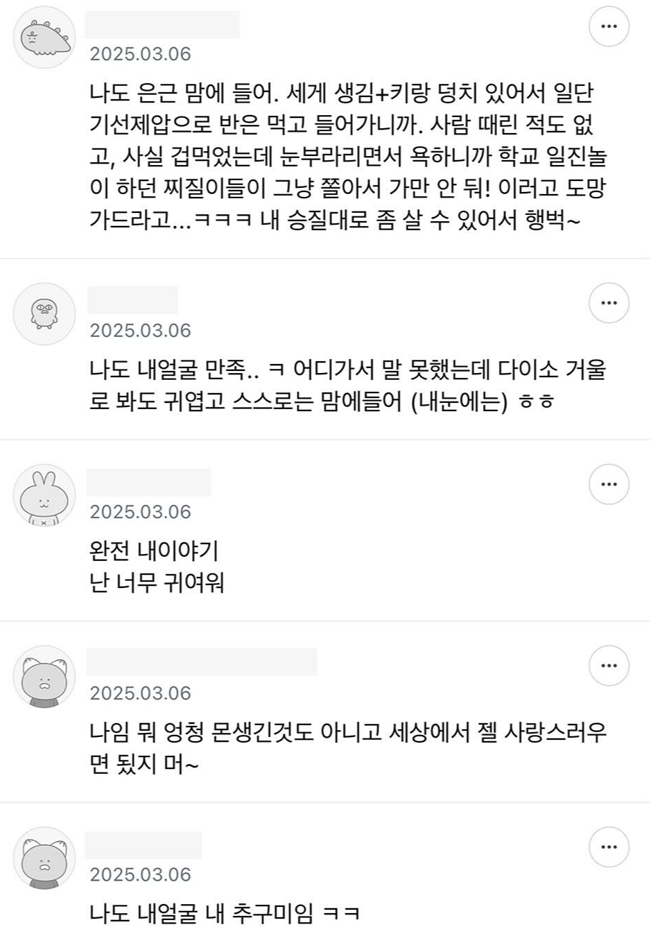 뭔가 이 긍정적이고 몽글몽글한 바이브 너무 좋고 뭔가 정 들었다는 말 왤케 공감되는지 모르겠네요. 어릴 땐 내 얼굴이 싫기도 했는데 나이 먹으면서 진짜 정들고 만족하게 됨. 추구미가 자기 자신이라든가 가족을 닮은 얼굴이 좋다든가 너무 예쁘고 멋진거 같아요. 글들이 너무 귀여워서 중간에 어떤 분이 얘기한 것 처럼 좋은 기운 같이 공감하고 느끼고 싶네요 :) 다들 즐거운 하루하루 되세요~!