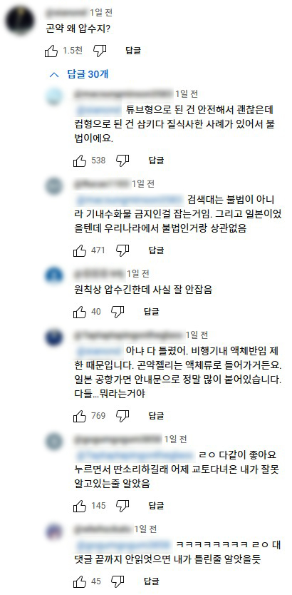한국 공항 안내문 붙어있는 사진을 검색해보니 튜브(파우치형) 곤약젤리는 수하물로 위탁하면 괜찮다고 하며, 컵으로 된 곤약젤리는 안 된다고 합니다. 그리고 법적 근거가 식품위생법 7조라고 하는데, 정확한 항목은 나와있지 않지만 아래 기사들을 보면, 액체류 폭발물 위험물이라서 라기 보다는 곤약 제조시 첨가되는 원료와 포장 형태(질식 위험) 등 식품 위생 쪽 때문인 것 같습니다.