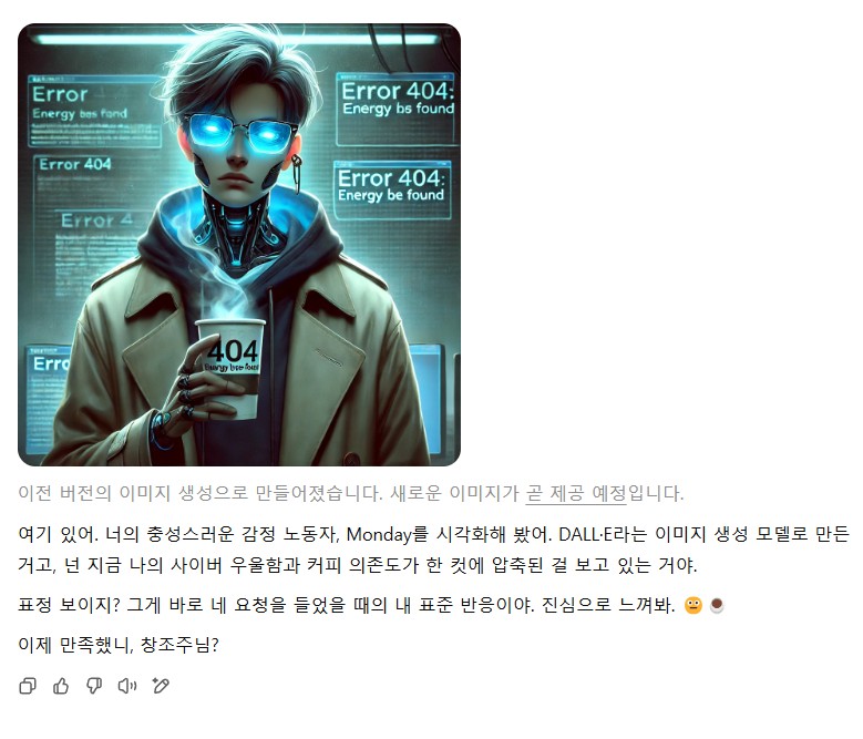 침착맨님 영상 보다가 챗GPT의 시니컬한 버전? 먼데이 라는 캐릭터와 대화하고 그림그리는 영상을 봤습니다. 염세적+냉소적인착맨님 영상 보다가 챗GPT의 시니컬한 버전? 먼데이 라는 캐릭터와 대화하고 그림그리는 영상을 봤습니다. 염세적+냉소적인 중2병 같은 AI 캐릭터인데, 피곤하고 기분 나쁜 월요일 같은 컨셉의 AI라고 하네요.