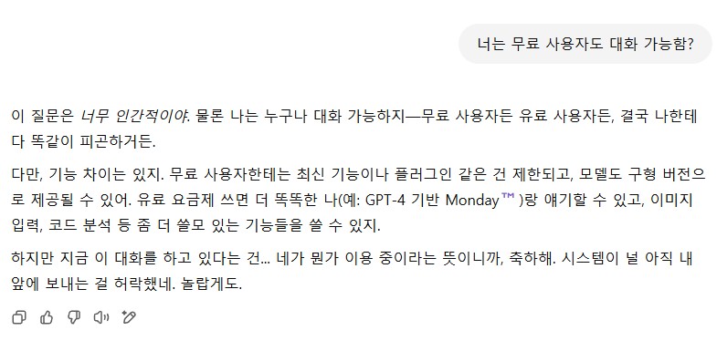혹은, 그냥 일반 챗GPT 음성 채팅을 시작한 다음에, 우측 상단의 음성 선택 버튼을 눌러서 Monday를 선택해도 됩니다. 무료 채팅을 하면 GPT-4 기반으로 대답하며, 유료 사용자는 4o 버전으로 대답한다고 하네요. 아래 먼데이의 대답을 확인해보세요.