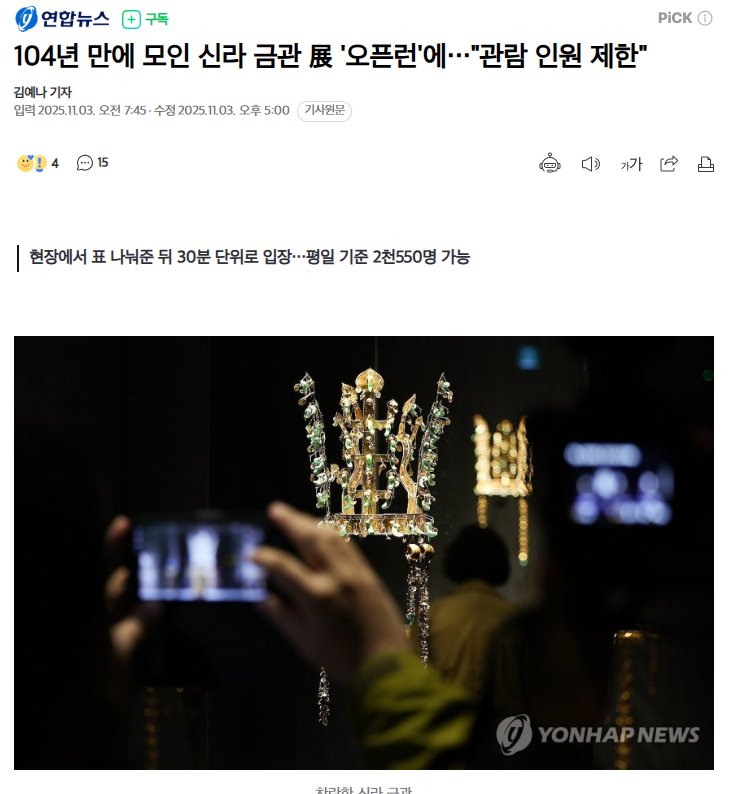 APEC 정상회의 행사 때문에 '신라 금관' 특별전은 11월 2일(일)부터 일반인 관람 오픈된다고 합니다.