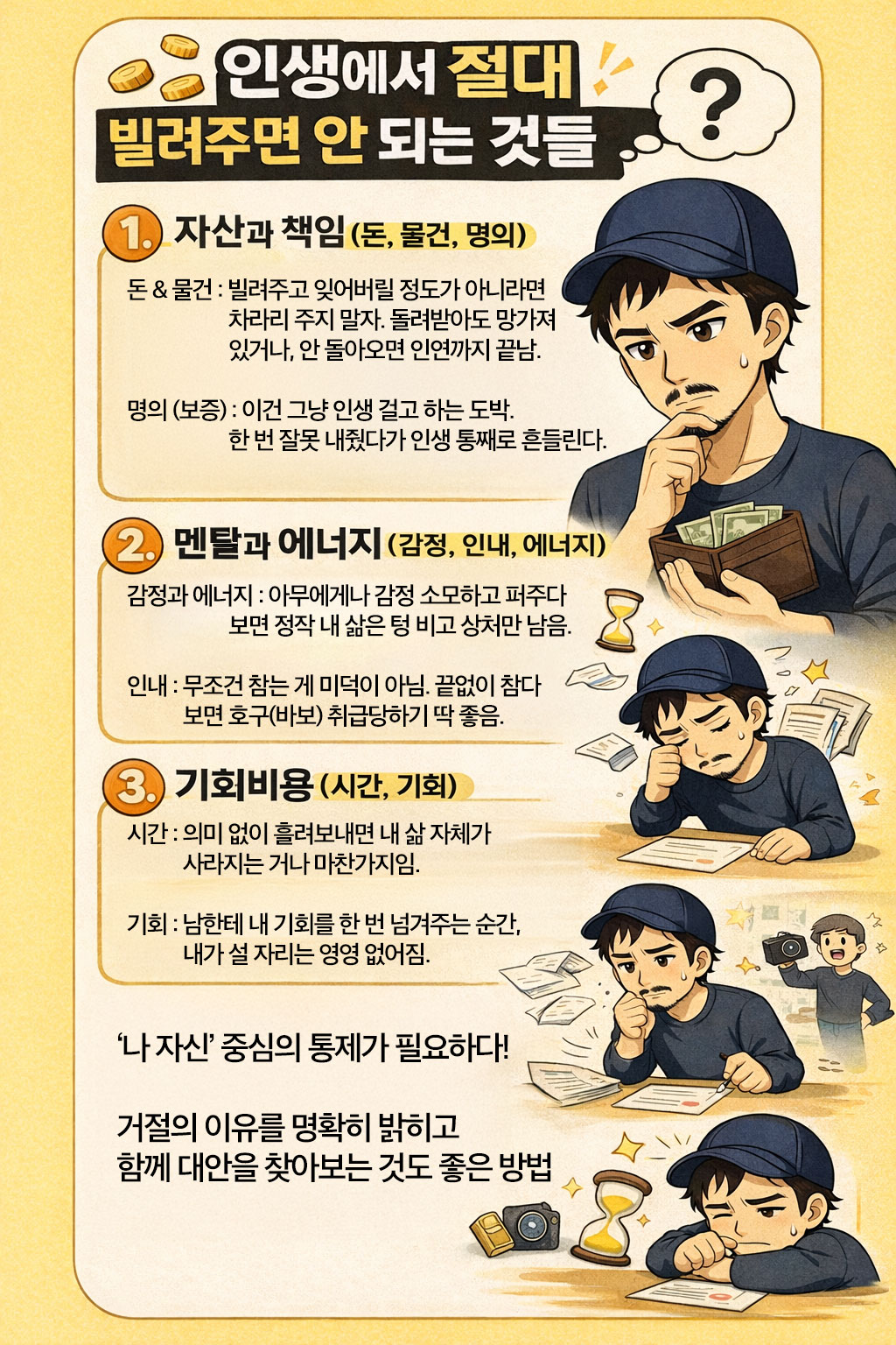 무조건 금지! 라기 보다는 쉽게 허락하면 안 되겠다는 얘기겠죠. 예스맨 같은 인생 살았던 분들이 거절이 힘든 경우가 많아서 후회하거나 상처 받는 경우를 종종 보게 됩니다...