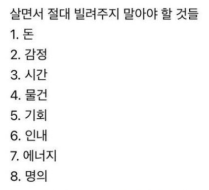 보증이나 돈은 진짜 안 좋게 끝난 경우를 너무 많이 보고, 그 과정에서도 사이가 틀어지는 경우가 많아서 진짜 피해야 할 것인 것 같고 나머지도 꽤 공감되는 것들이네요. 물건도 결국 상해서 돌아오는 경우가 많아서 찐친 막 써도 괜찮을 정도 아니면 진짜 신경 쓰이고ㅎ